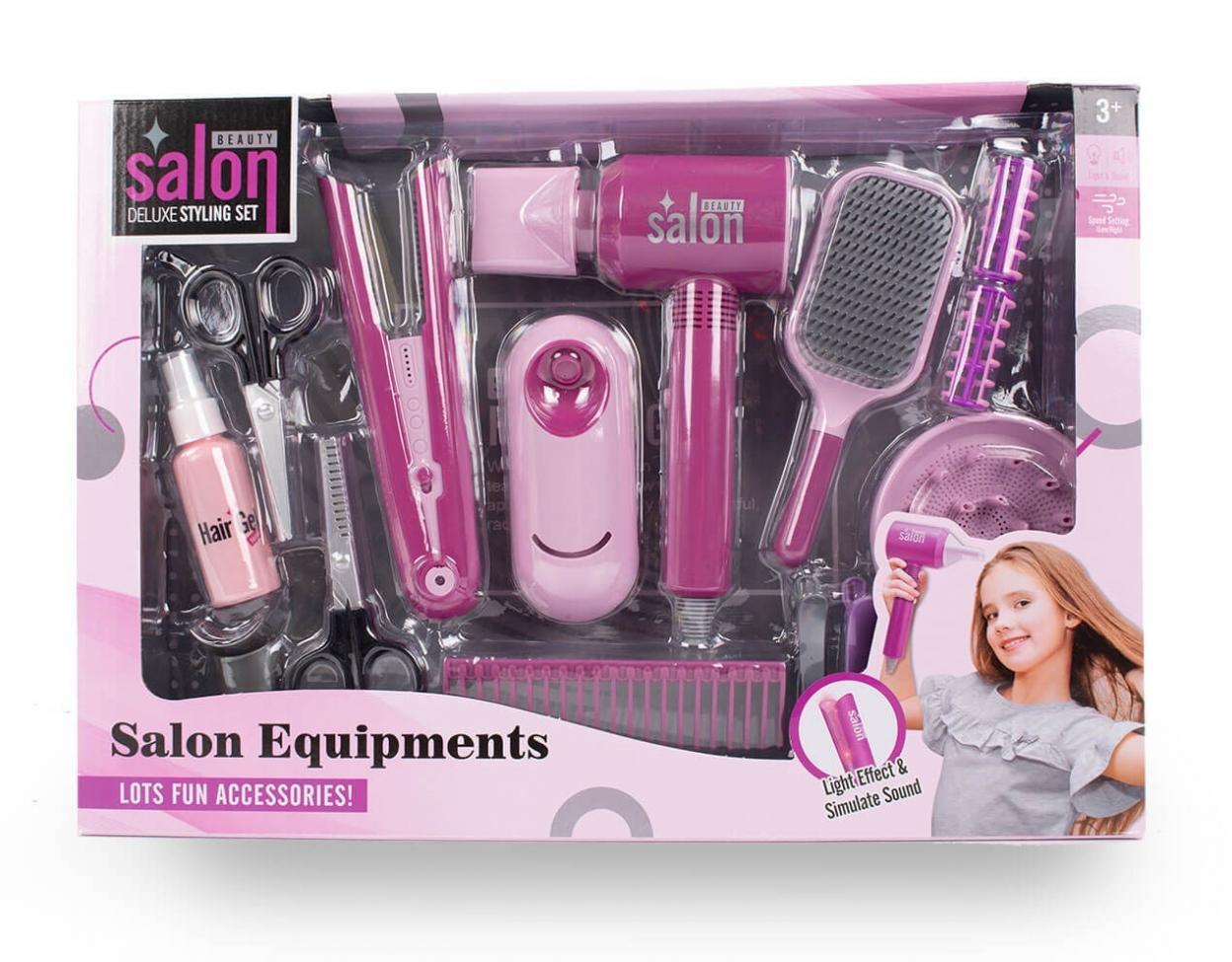 Realistyczny zestaw fryzjerski dla dzieci - suszarka, prostownica, szczotki, wałki, nożyczki, akcesoria.