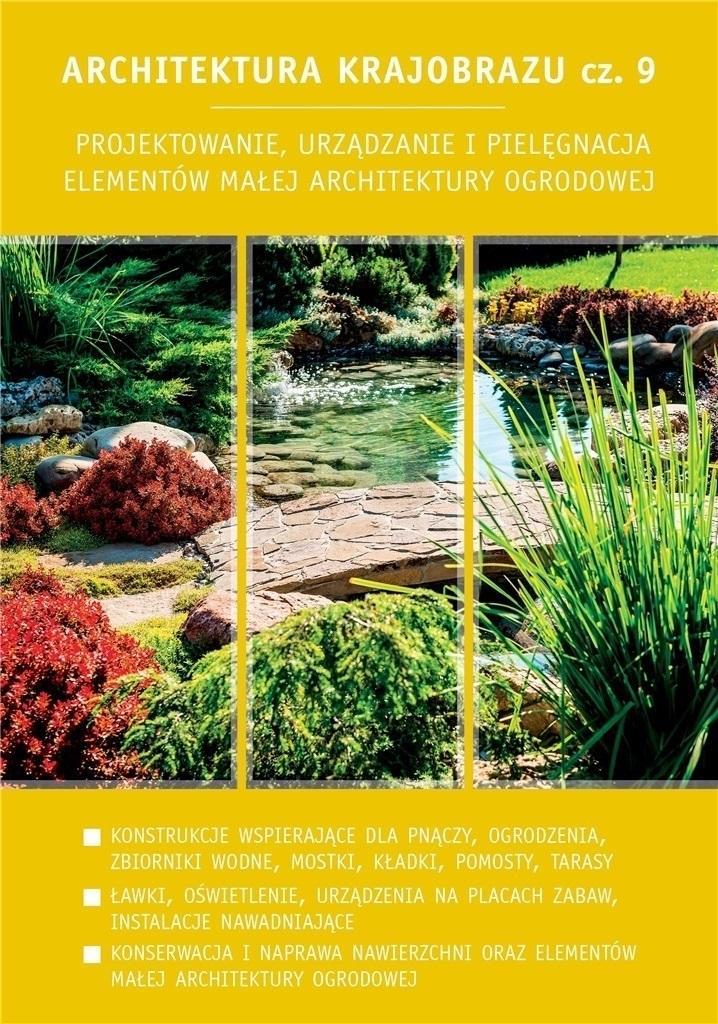 W części 9. podręcznika Architektura krajobrazu zapoznamy się z zasadami projektowania oraz budowy i konstrukcji różnych rodzajów podpór dla pnączy, ogrodzeń, ozdobnych zbiorników wodnych, mostków, kładek i pomostów, tarasów, zielonych dachów oraz takich elementów wyposażenia terenów zieleni, jak: ławki ogrodowe, kosze na śmieci, tablice informacyjne, słupki, oświetlenie, instalacje nawadniające, urządzenia przeznaczone na place zabaw dla dzieci. Nie zabraknie również informacji związanych z konserwacją i naprawą nawierzchni dróg oraz elementów małej architektury ogrodowej.