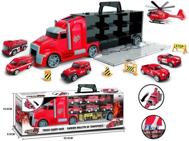 Ekscytujący Zestaw Strażacki w Praktycznej Walizce - Centrum Dowodzenia Małego Bohatera! Czy Twój maluch marzy o zostaniu odważnym strażakiem? Ten bogaty zestaw to idealny prezent, który rozbudzi wyobraźnię i zapewni długie godziny kreatywnej zabawy. Zestaw zawiera dużą, czerwoną ciężarówkę z naczepą, która w mgnieniu oka transformuje się w interaktywne centrum dowodzenia akcją ratunkową. Wewnątrz tej mobilnej bazy strażackiej Twoje dziecko odkryje różnorodną flotę pojazdów ratowniczych. Znajduje się tutaj szybki helikopter gotowy do akcji z powietrza, kilka dynamicznych samochodów strażackich, w tym wozy dowodzenia i pojazdy specjalne, które pomogą w każdej sytuacji. Dodatkowe akcesoria, takie jak znaki "STOP" i pachołki drogowe, urozmaicą scenariusze zabaw i pozwolą na realistyczne odgrywanie misji ratunkowych. Ten zestaw nie tylko dostarcza mnóstwo frajdy, ale również rozwija zdolności manualne i koordynację wzrokowo-ruchową. Solidne wykonanie i bezpieczne materiały gwarantują trwałość i bezpieczeństwo podczas zabawy. A co najważniejsze dla rodziców - po skończonej zabawie wszystkie elementy można wygodnie schować wewnątrz ciężarówki, która pełni funkcję praktycznej walizki z uchwytem. Dzięki temu utrzymanie porządku jest dziecinnie proste, a zestaw idealnie nadaje się do zabrania w podróż czy do dziadków. Zestaw przeznaczony jest dla dzieci w wieku 3 lat i więcej. Podaruj swojemu dziecku ten fantastyczny zestaw strażacki i obserwuj, jak wciela się w rolę bohaterskiego strażaka, gotowego nieść pomoc w każdej sytuacji!
