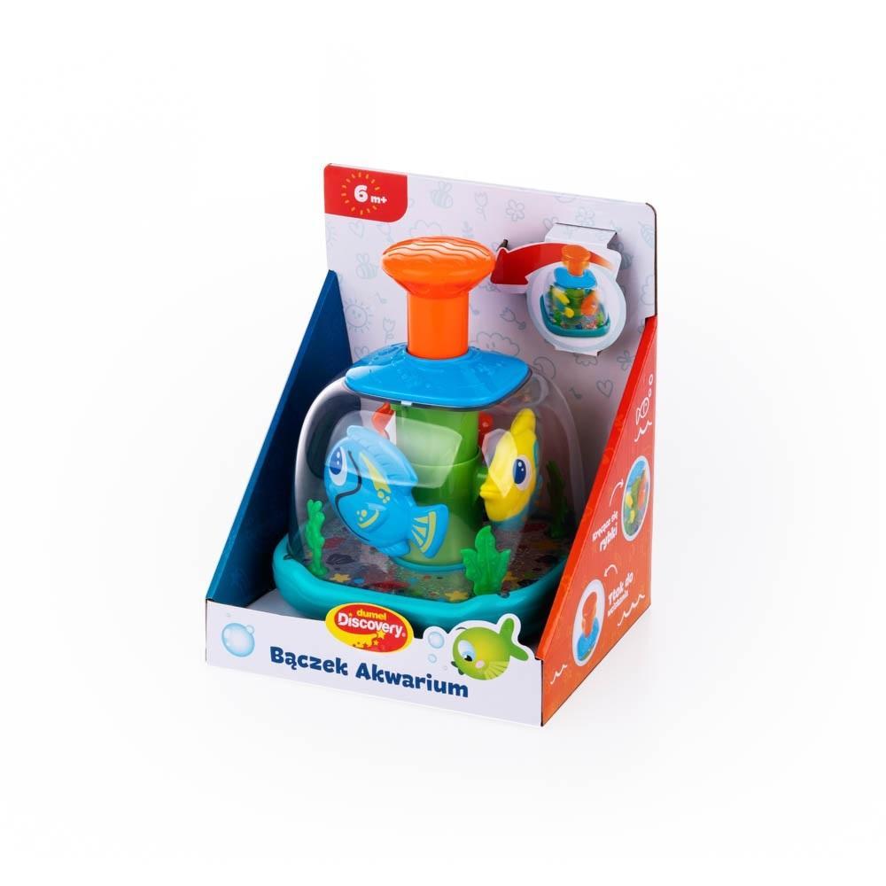 "Wirująca zabawa w podwodnej odsłonie! Ten wesoły bączek jest wypełniony rybkami i morskimi roślinkami. Im szybciej maluch będzie wciskał pomarańczowy tłok, tym szybciej będą się kręcić rybki. Nasadę bączka i tłok zdobią wypukłe wzory, idealne do eksplorowania małymi rączkami.