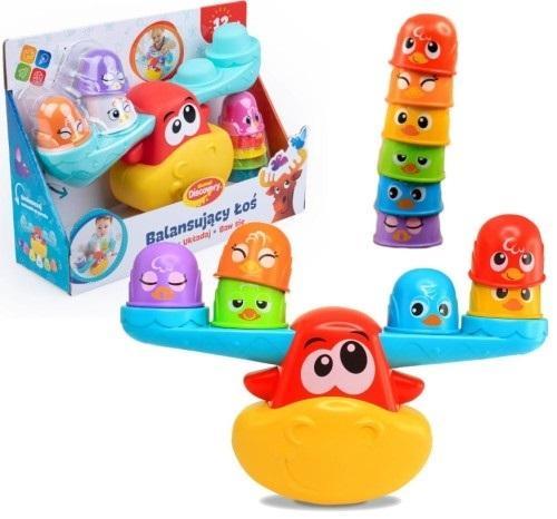 - zestaw składa się z równoważni w formie łosia i 7 kolorowych kubeczków - ptaszków.
