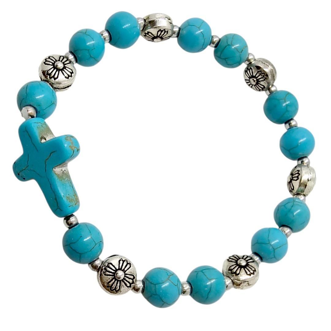 Turkusowa Bransoletka z Krzyżem - Kamienne Kuleczki i Ozdobne Tłoczenia