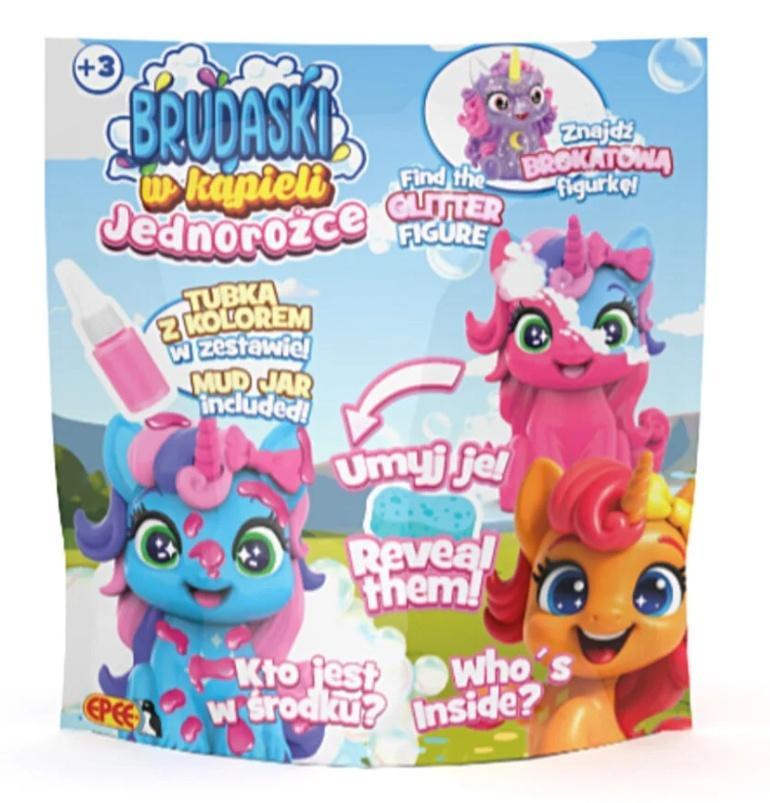 Zawartość opakowania: 1 figurka jednorożca, 1 tubka z różowym błotkiem, 1 akcesorium