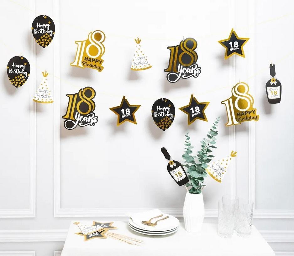 Dekoracja urodzinowa 18 Skład zestawu: 12 x dekoracje na drewnianym klipsie 12 x dekoracje na patyczku 12 x taśm dekoracyjnych 1 x wstążka 3 m