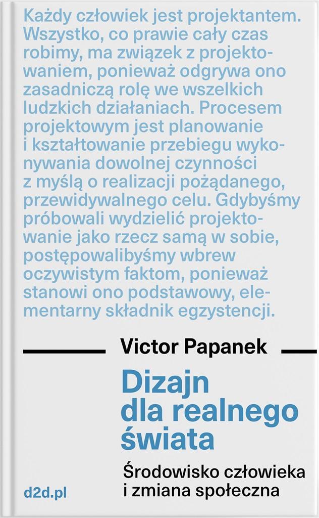 Dizajn dla realnego świata to najbardziej poczytna książka o projektowaniu i obowiązkowa lektura w wielu szkołach projektowania i architektury. Żywy i pouczający wykład Victora Papanka pokazuje, w jaki sposób projektowanie może stanowić wsparcie w zmaganiach z takimi współczesnymi bolączkami, jak zanieczyszczenie środowiska, przeludnienie, głód, marnotrawstwo zasobów. Autor prowadzi nas od "fetyszy dla społeczeństwa przesytu" do nowej ery projektowania moralnie i ekologicznie odpowiedzialnego.