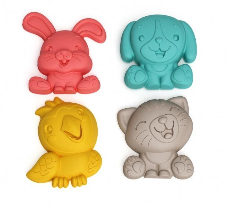 Zestaw zawiera 4 foremki w kształcie zwierzątek domowych: królik, pies, kot, papuga.