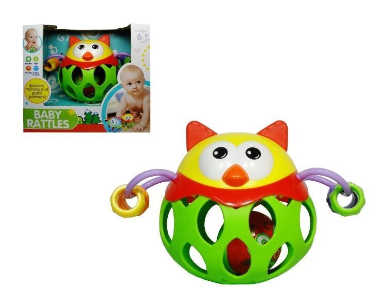 Plastikowo-gumowa grzechotka zwierzątko. W swoim wnętrzu posiada piłeczkę grzechotkę co oddziałuje na słuch u dzieci. Poza tym część tyłowia wykonana jest z tworzywa gumowego posiada także otwory które ułatwią chwytanie zabawki przy okazji rozwinie motory