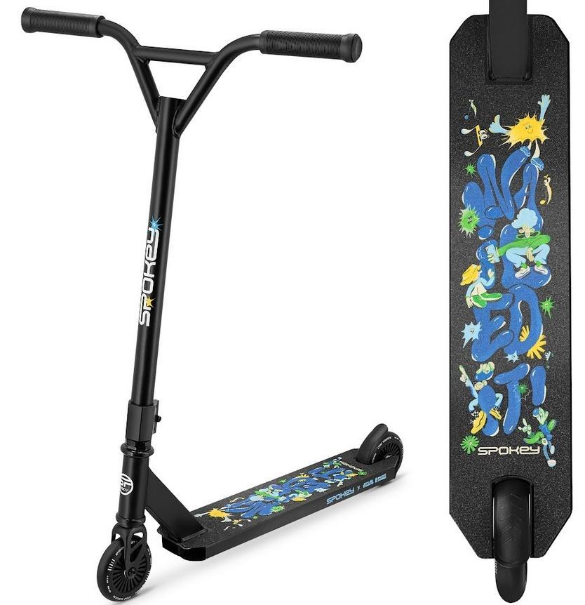 Hulajnoga wyczynowa o wzmocnionej konstrukcji i niewielkiej wadze to idealny wybór dla początkujących skaterów. Antypoślizgowy deck oraz stalowa kierownica, świetnie sprawdzą się podczas pierwszych tricków. Posiada 3-pinowy łącznik, wysokiej klasy łożyska ABEC-7, kółka 100 mm oraz hamulec nożny. Grafika zaprojektowana przez polskiego ilustratora Karola Banacha.