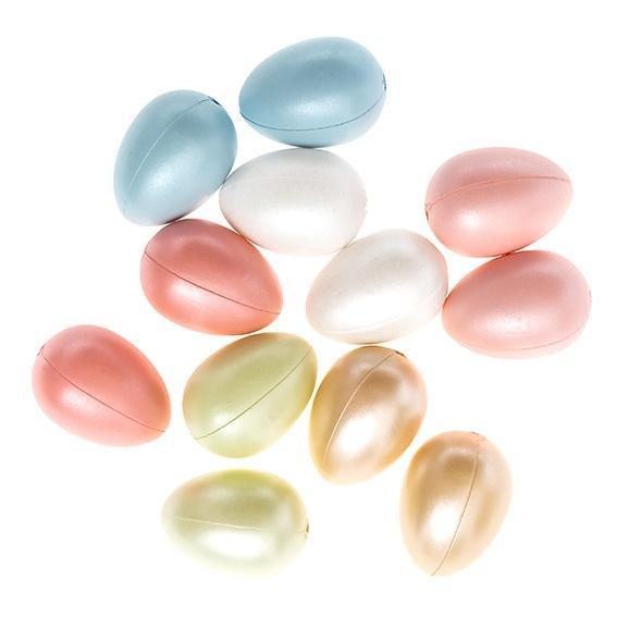 Zestaw dekoracyjnych jajeczek w delikatnych, pastelowych odcieniach z eleganckim, perłowym połyskiem. Wykonane z nietłukącego się materiału, leciutkie, wykończone farbą na bazie wody, bez zapachu.
