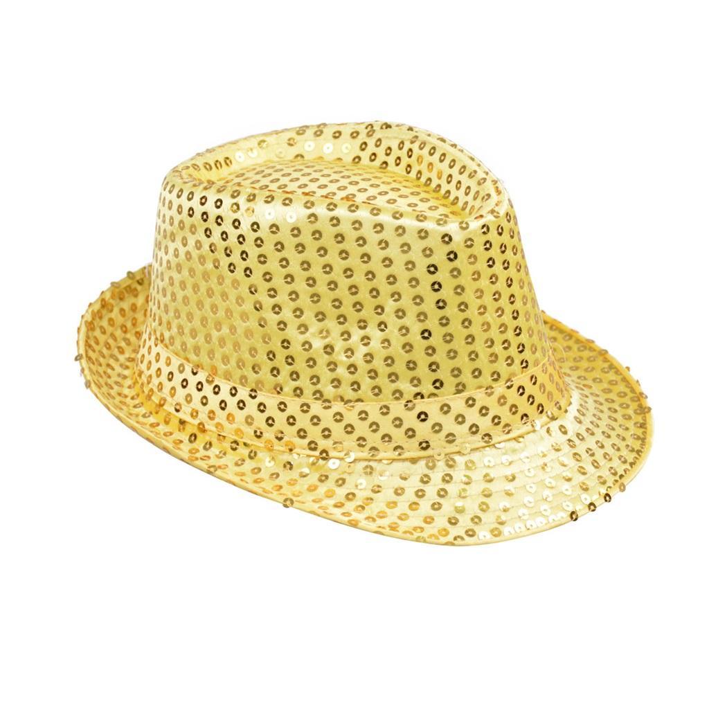 Imprezowy kapelusz w kolorze złotym obszyty cekinami. Kapelusz ładnie mieni się w świetle. Gadżet na bal karnawałowy, zabawę tematyczną, bal przebierańców. Rozmiar uniwersalny dla osoby dorosłej.