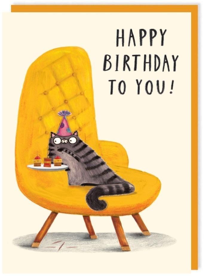 KARNET 309 URODZINY KOT Z PRZEKĄSKAMI NA FOTELU