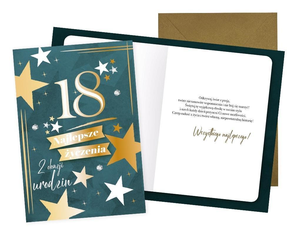 Kartka Dream Cards na Osiemnastkę "Najlepsze życzenia" DK-1286 Kartka B6 z ozdobnej serii Dream Cards - nieduża, ale robi wrażenie dzięki atrakcyjnej kolorystyce i ciekawym zdobieniom. To idealny wybór łączący przyjazną cenę z jakością. Cechy szczególne: wielkość: B6, 16.6 x 11.7 cm po złożeniu, koperta: w zestawie, kolorowa, zdobienia: kolorowe, różnorodne, bogate (w zależności od wzoru: przyklejane dekoracje, elementy biżuteryjne, odstawniki, metaliczne folie, tłoczenia itp.), okazja: osiemnastka, urodziny