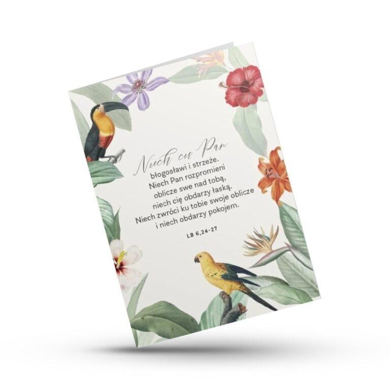 Piękna, kolorowa ilustracja z motywem tropikalnych kwiatów i ptaków nadaje jej radosny i pełen życia charakter. Idealna na urodziny, bierzmowanie, ślub lub jako duchowe wsparcie.