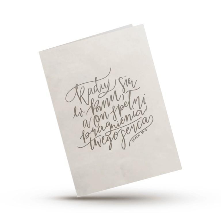 Delikatny, beżowy odcień tła w połączeniu z ręcznie pisaną kaligrafią tworzą prostą, elegancką i pełną treści formę. Cytat z Psalmu 37,4 przypomina o Bożej dobroci i zachęca do życia w ufności, wdzięczności i radości z Jego obecności.