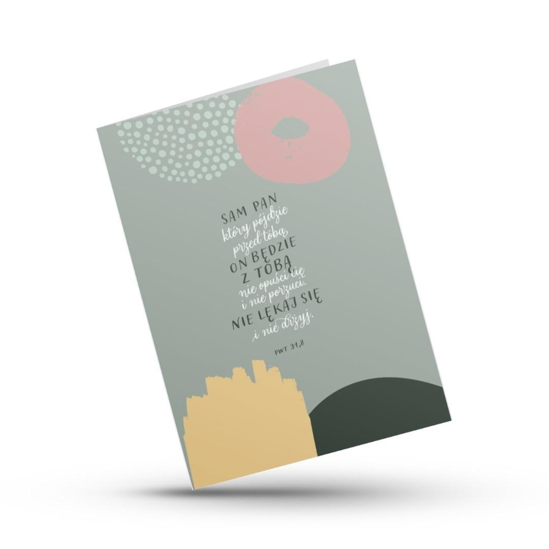 Kartka z cytatem z Księgi Powtórzonego Prawa 31,8 przypomina o Bożej obecności w każdym kroku życia. Nowoczesny, graficzny projekt łączy pastelowe barwy z głębokim przesłaniem wiary i nadziei.