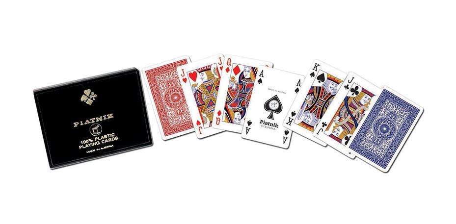 Najwyższej jakości w 100% plastikowe karty renomowanej firmy Ferd. Piatnik & Sohne. Czarne, tradycyjne pudełko zawiera 2 talie, składające się z 55 kart o wymiarach 58 x 89 mm. Idealne zarówno do brydża, pokera, remika jak i innych gier. Wyroby wiedeńskiej fabryki Ferd. Piatnik & Sohne od 1824 roku urzekają bogactwem wzorów i perfekcją wykonania. Jakość i tradycja!