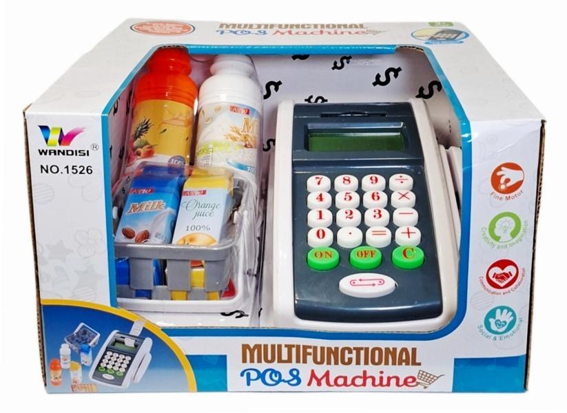Zabawka kasa fiskalna z akcesoriami napoje, koszyk, produkty spożywcze. Zapakowana w kartonowe pudełko. Zabawka przeznaczona dla dzieci od lat 3. Produkt działa na baterie typu AA. Baterie nie są załączone do zabawki.