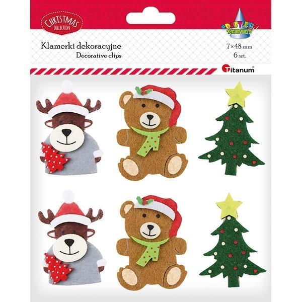 Klamerki drewniane z dekorem naturalne 7x48mm renifer 37x54mm, miś 40x54mm, choinka 38x54mm 6szt.