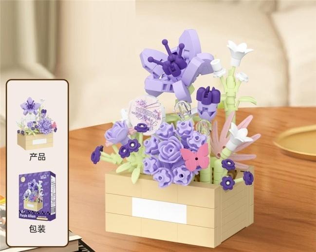 Ten zestaw klocków oferuje niepowtarzalną możliwość stworzenia trwałego, miniaturowego bukietu fioletowych kwiatów, który nigdy nie zwiędnie. Model przedstawia bogatą kompozycję różnorodnych kwiatów, w tym okazałe lilie, delikatne róże i mniejsze akcenty kwiatowe, wszystko w odcieniach lawendy i głębokiego fioletu. Kompozycja umieszczona jest w estetycznej doniczce w kolorze jasnego drewna lub beżu, zbudowanej z klocków. Całość urozmaica uroczy różowy motyl, dodając bukietowi lekkości i uroku. Ten zestaw jest idealny dla każdego, kto ceni sobie kreatywne hobby i piękne, nietypowe dekoracje. To doskonały prezent na każdą okazję, który zapewnia satysfakcję z budowania i cieszy oko jako element wystroju wnętrza. Klockowa konstrukcja gwarantuje trwałość i bezproblemową pielęgnację.