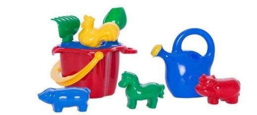 Zestaw zawiera wiaderko "Kogucik" z sitkiem, łopatkę, grabki, 4 foremki w kształcie zwierzątek oraz konewkę "Stokrotka" dla Małych Ogrodników. Poszczególne elementy są małe i lekkie. Idealne do podróży.