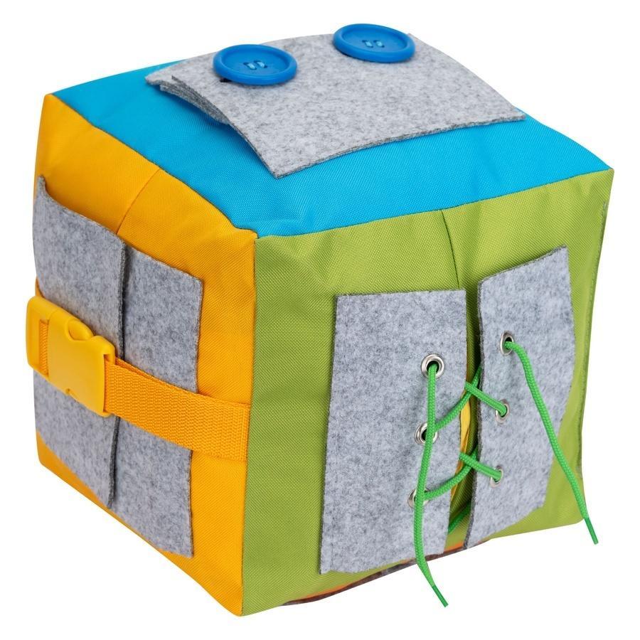 - Kieszonki: Każda ścianka kostki zawiera kieszonkę, zachęcające dziecko do wkładania i wyjmowania przedmiotów, co rozwija koordynację ręka-oko.