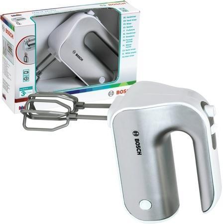KL 9240 Mikser Bosch Srebrny Mikser Klein powstał na licencji Bosch, dlatego też są wierną kopią prawdziwego urządzenia produkowanego przez tę firmę. Firma Klein od lat produkuje odpowiedniki prawdziwych narzędzi i akcesoriów AGD, przeznaczone do zabawy dla najmłodszych. Mikser jest w kolorze srebrnym. Zabawka jak prawdziwa, ma obracane mieszadła, które włącza się za pomocą przycisku. Do właściwego funkcjonowania zabawki niezbędne jest użycie baterii, które nie są częścią zestawu. Dodatkowo mikser posiada ruchomy przełącznik będący imitacją regulacji prędkości pracy miksera. Ponadto mieszadła po skończonej zabawie można zdemontować i jak prawdziwe umyć. Ważną zaletą zabawki jest nie tylko jej pełna funkcjonalność, ale również gwarancja bezpieczeństwa, gdyż wszystkie elementy zostały wykonane z plastiku. Materiały, są najwyższej jakości, a także bezpieczne dla dziecka. Zabawka pozwoli każdemu dziecku na naśladowanie rodziców w sposób bezpieczny i pełen dobrej zabawy. Wielkość wszystkich elementów i akcesoriów zestawu jest dopasowana do potrzeb i rączek dziecka. Zabawka z pewnością będzie również świetnym uzupełnieniem pozostałych zestawów kuchennych firmy Klein. Specyfikacja: Produkt jest zabawką Zabawka przeznaczona dla dzieci powyżej 3 roku życia Waga : 0,2 kg Wymiary opakowania : 19x7x12 cm Wymagane baterie : 1 x R6 (AA) Ilość w opakowaniu zbiorczym : 6 Kraj pochodzenia : Chiny Seria zabawek AGD firmy KLEIN realistycznie odzwierciedla prawdziwe urządzenia wprowadzone na rynek przez najbardziej znane i jakościowo najlepsze marki produktów. Dla małych gospodyń domowych to niesamowita atrakcja! Dzieci z chęcią uczą się pomagać w wykonywaniu domowych czynności jednocześnie świetnie się przy tym bawiąc. Każdy ze sprzętów kuchennych pomoże w przygotowaniu zarówno małej przekąski jak i wykwintnego przyjęcia dla lalek lub koleżanek. Dodatkową zaletą tych zabawek jest to, że ich kolorystyka jest odpowiednia dla dziewczynek oraz dla chłopców.