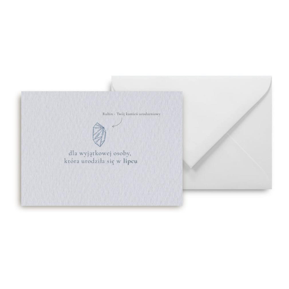 Wyjątkowa kartka z rubinem kamieniem lipca, symbolizującym namiętność, energię i radość życia.