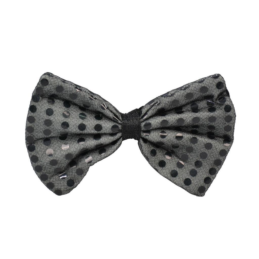 Błyszcząca muszka w kolorze czarnym. Mucha zdobiona jest połyskującymi kropeczkami. Mocowanie za pomocą elastycznej gumeczki zapewnia wygodne noszenie oraz zakładanie. Zabawny element stylizacji na zabawę karnawałową, imprezę tematyczną, przyjęcie w stylu disco. Muszka o wymiarze 14x9 cm.