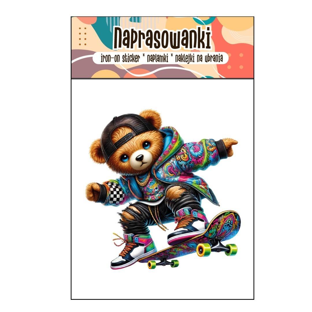 Naprasowanka prezentująca zabawną postać Misia na kolorowej deskorolce.