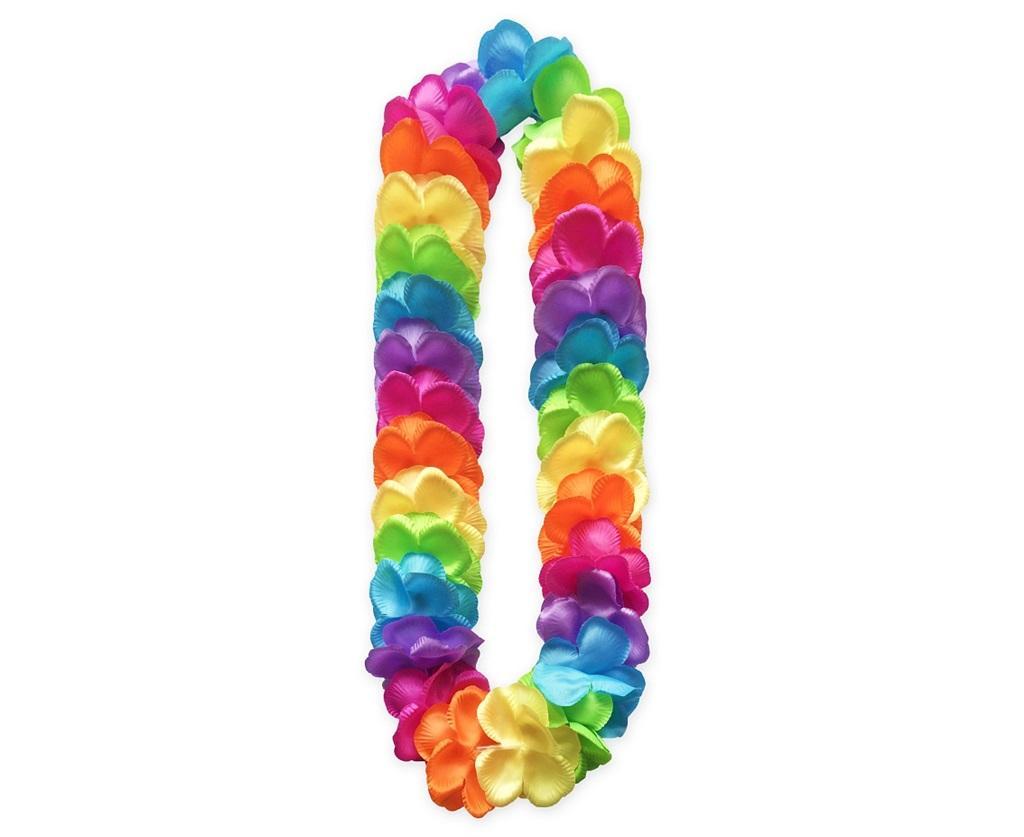 NASZYJNIK HAWAJSKI SATYNOWY Długość: ok. 120 cm Ilość sztuk w opakowaniu: 1 Kolor: wielokolorowy Wykonany z materiałowych wielokolorowych kwiatów. Kwiaty oddzielone są od siebie przeźroczystymi, cienkimi słomkami, dzięki czemu nie ściągają się ani nie zsuwają w jedno miejsce.