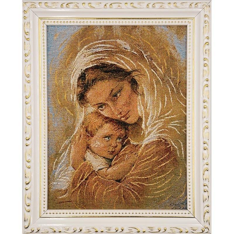 Haftowany Obraz w Białej Ramie Matka Boska Tuląca Jezusa - Malarskie Ujęcie Czułości, 22x27,5 cm