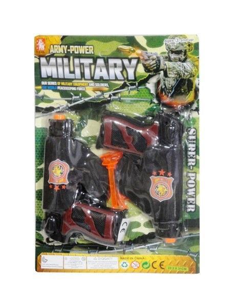 Zestaw 2 pistoletów w kaburze razem z 4 strzałkami. Pomoże dzieciom ćwiczyć celność. Produkt zapakownay w kartonową podstawkę z przezroczystym kloszem. Zabawka dla dzieci od 3 lat. Podane wymiary stanowią wymiar opakowania.