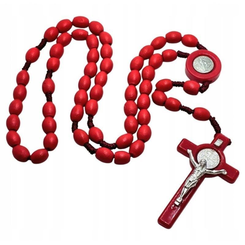 Czerwony Różaniec z Medalikiem św. Benedykta - Drewniane Koraliki, Symbol Ochrony
