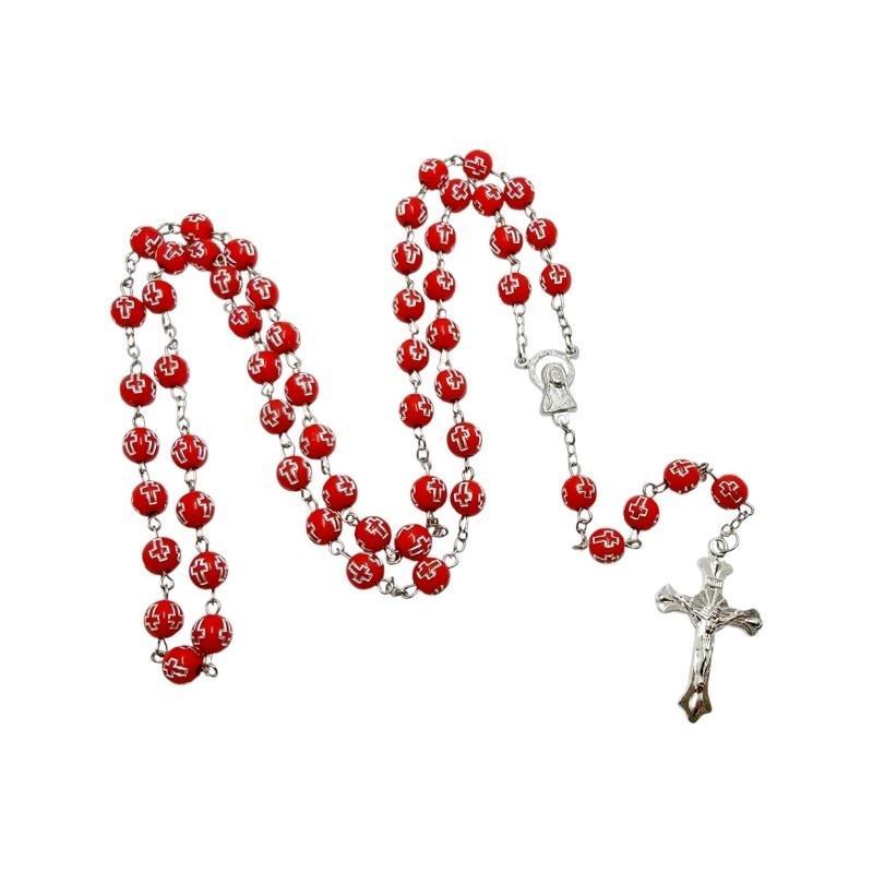 Koraliki o średnicy 8 mm zostały wykonane z wytrzymałego plastiku. Każdy z nich ozdobiono wytłoczonymi krzyżykami, wypełnionymi srebrnym kolorem, co nadaje całości eleganckiego i minimalistycznego charakteru.Połączenie koloru czerwonego i srebra tworzy efektowny kontrast,a faktura koralików sprawia, że są przyjemne w dotyku.