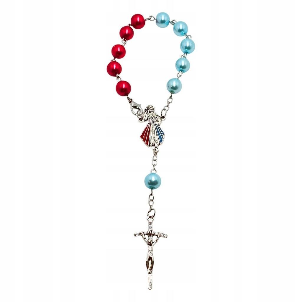 Wyjątkowa, zapinana dziesiątka różańca, idealna do codziennej modlitwy, a także jako religijny akcent w samochodzie. Łącznikiem jest wizerunek Jezusa Miłosiernego, a całość zwieńczona jest krzyżem papieskim. Kuleczki dziesiątki są w dwóch kolorach: błękitnym i czerwonym, nawiązując do promieni miłosierdzia z obrazu "Jezu, ufam Tobie". Ta piękna i praktyczna dziesiątka różańca to doskonały sposób na duchowe wsparcie w podróży i codziennym życiu.