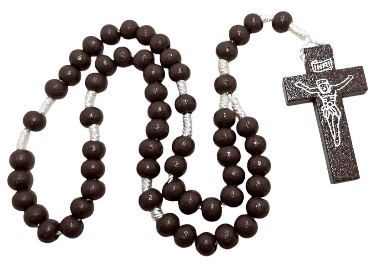 Klasyczny różaniec wykonany z naturalnego drewna, pomalowanego na głęboki, ciemnobrązowy kolor. Kontrastujący biały, trwały sznurek łączy koraliki o wygodnej wielkości 8 mm. Centralnym elementem różańca jest wyraźny, drewniany krzyż o wymiarach 42x25 mm. Długość całego różańca wynosi 28 cm. To eleganckie połączenie ciemnego drewna z jasnym sznurkiem czyni ten różaniec ponadczasowym przedmiotem modlitwy i wyrazem wiary.