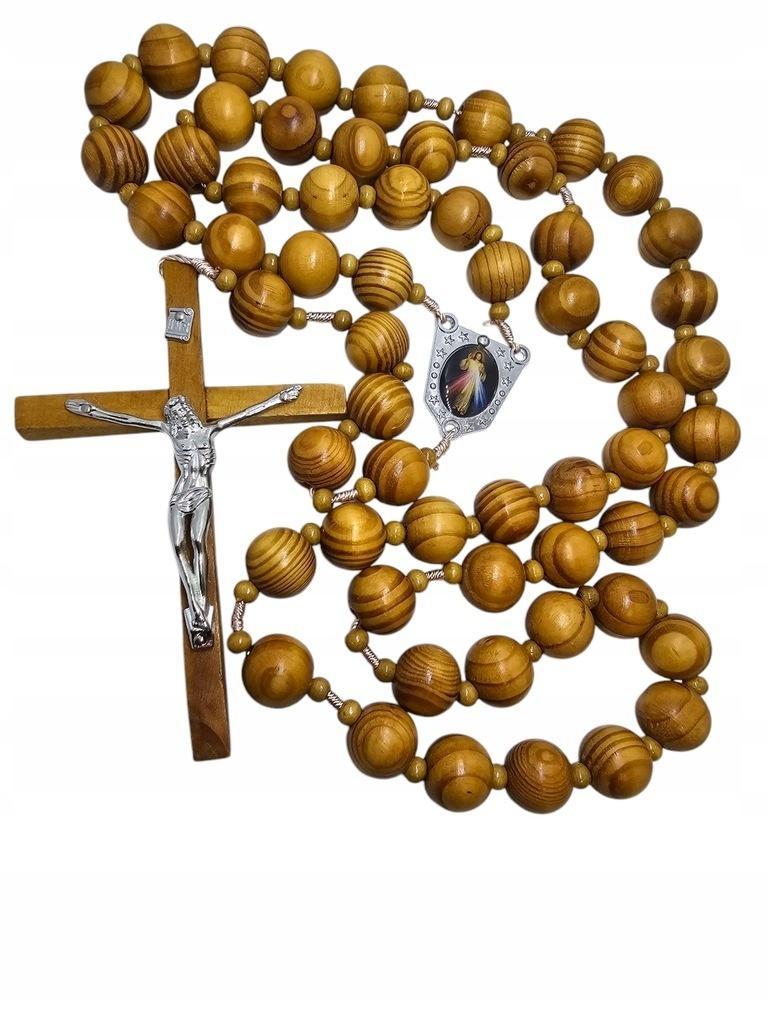 Centralnym elementem tego różańca jest pięknie wykonany łącznik z wizerunkiem "Jezu, Ufam Tobie". Ten mocny symbol miłosierdzia Bożego będzie nieustannym przypomnieniem o zaufaniu i nadziei. Całość wieńczy solidny, drewniany krzyż o imponujących wymiarach 14x9 cm, stanowiący mocny akcent i symbol odkupienia.