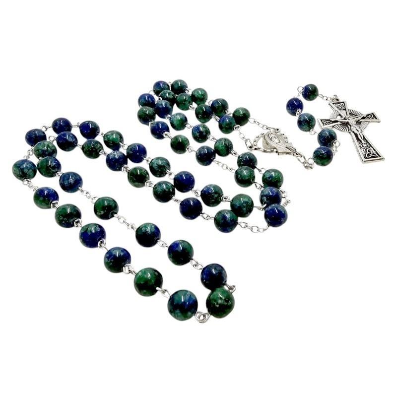 Podaruj niezapomniany, duchowy dar, który łączy w sobie głębię wiary z niezrównanym pięknem natury. Ten wyjątkowy, 56-centymetrowy różaniec został stworzony z fascynującego naturalnego kamienia Azurytu, którego gładkie koraliki o wielkości 8 mm mienią się hipnotyzującymi odcieniami głębokiego błękitu i zieleni. Każdy koralik to unikatowe dzieło natury, a ich subtelna gra barw zaprasza do kontemplacji i wyciszenia. Z obwodem wynoszącym 78 cm, różaniec doskonale układa się w dłoni, zapewniając komfort podczas każdej modlitwy.