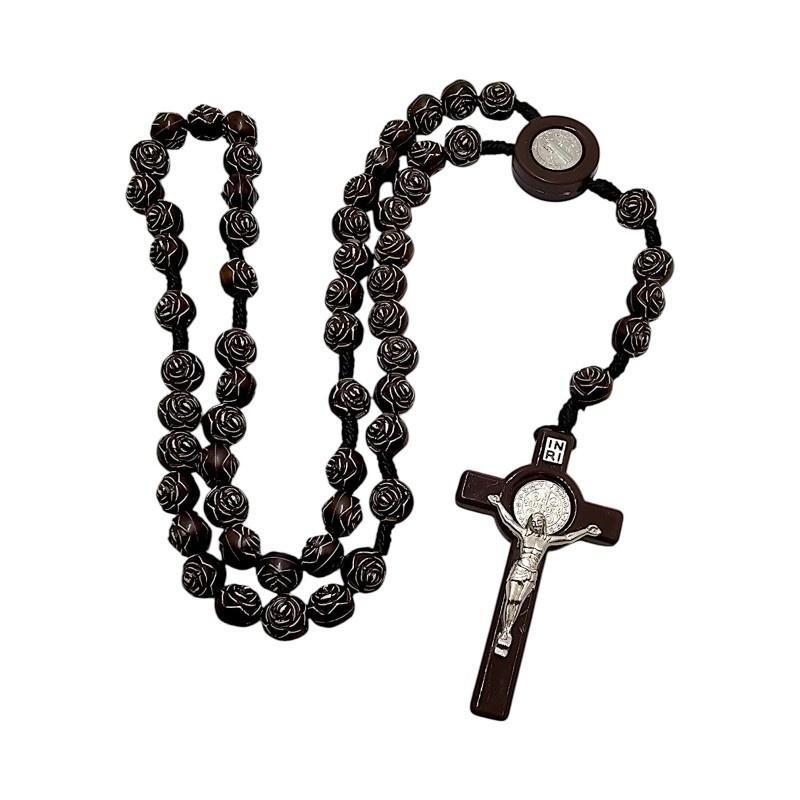Różaniec został wykonany z trwałych, brązowych, plastikowych koralików o wielkości 10 mm, które są przyjemne w dotyku. Każdy z paciorków ma unikalny kształt pięknie uformowanej róży, co nadaje całości eleganckiego i symbolicznego charakteru. Łącznikiem jest medalik Świętego Benedykta, a całość wieńczy duży krzyż Świętego Benedykta o imponujących wymiarach 36x63 mm.