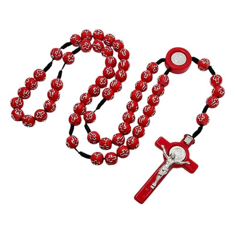 Różaniec został wykonany z trwałych, czerwonych, plastikowych koralików o wielkości 10 mm, które są przyjemne w dotyku. Każdy koralik zdobią wygrawerowane krzyże wypełnione srebrnym kolorem, co nadaje całości eleganckiego charakteru. Łącznikiem jest medalik Świętego Benedykta, a całość wieńczy duży krzyż Świętego Benedykta o imponujących wymiarach 36x63 mm.