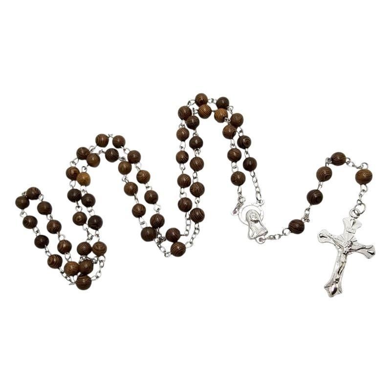 Elegancki Plastikowy Drewnopodobny Różaniec na Łańcuszku - Maryja i Metalowy Krzyż