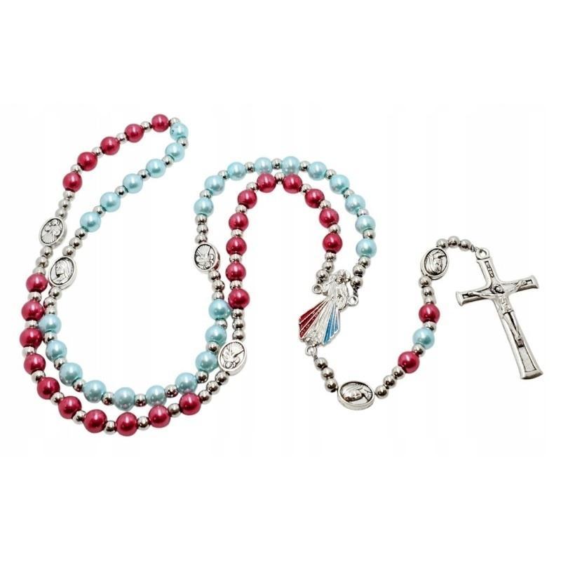 Wyjątkowy różaniec z Jezusem Miłosiernym, łączący w sobie głęboką symbolikę i piękny design. Każda dziesiątka różańca oddzielona jest medalikiem z wizerunkiem Jezusa Miłosiernego z jednej strony i Matki Bożej z Medugorie z drugiej. Całość wieńczy efektowny krzyż na którego odwrocie jest napis "Medugorie i Mir Mir Mir". Łącznik przedstawia Jezusa Miłosiernego, a koraliki, nawiązujące do krwi i wody wypływającej z Serca Jezusa, wykonane są ze szkła w kolorach czerwonym i niebieskim. Każdy koralik oddzielony jest srebrną, plastikową kuleczką.
