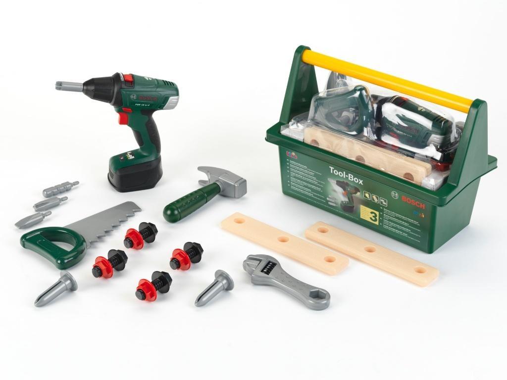 Skrzynka z narzędziami i wiertarko-wkrętarką Klein powstała na licencji Bosch, dlatego też narzędzia wchodzące w jej skład są wiernymi kopiami faktycznie istniejących narzędzi tej marki. Zestaw zapakowany jest w ciemno-zieloną pojemną skrzynkę na narzędzia. Skrzynka posiada żółtą wygodną rączką oraz dodatkową zawartość 7 elementów w komplecie. Głównym narzędziem skrzynki jest wiertarko-wkrętarka Bosch na baterie (KL 8567). Wiertarko-wkrętarka ma regulowane obroty w prawą i lewą stronę, włączane czerwonym przyciskiem, z boku zabawki, jak również dwie prędkości pracy, regulowane czerwonym przełącznikiem na czole urządzenia. Dodatkowo zabawka ma w komplecie cztery srebrne wymienne bity (wiertła), a także w w podstawie urządzenia białą diodę oświetlającą miejsce pracy. Zabawka jak prawdziwa ma wygodny uchwyt z gumową powierzchnią ułatwiającą utrzymanie zabawki w dziecięcych dłoniach. Wiertarko-wkrętarka podczas swojej pracy wydaje realistyczne dźwięki imitujące odgłosy pracy prawdziwego urządzenia. Ponadto w zestawie znajduje się piła ręczna, młotek, klucz francuski, dwie plastikowe deseczki z otworami do wkręcania śrub, a także 4 śruby z nakrętkami i 2 plastikowe gwoździe. Wszystkie elementy zestawu są wykonane z plastiku, pozbawione ostrych krawędzi i całkowicie bezpieczne dla dziecka. Dzięki wysokiej jakości wykonania śruby wkręca i wykręca się z dużą łatwością. Bawiąc się wiertarko-wkrętarką czy pozostałymi narzędziami skrzynki dzieci już od najmłodszych lat w bezpieczny sposób będą mogły wcielić się w rolę majsterkowicza, zapewniając sobie realistyczne doświadczenie korzystania z wszystkich jego części. Zestaw umożliwia maluchom kreatywną zabawę i doskonalenie umiejętności manualnych. Dzieci uwielbiają naśladować rodziców wykonujących codzienne czynności domowe lub w nich uczestniczyć, jednak nie zawsze jest to możliwe ze względów bezpieczeństwa, a dzięki tej całkowicie bezpiecznej dla dzieci, zabawkowej skrzynce z wiertarko-wkrętarką i narzędziami każdy mały majsterkowicz może bezpiecznie robić to, co jego opiekunowie. Zabawka wymaga użycia baterii, które nie są zawarte w zestawie.