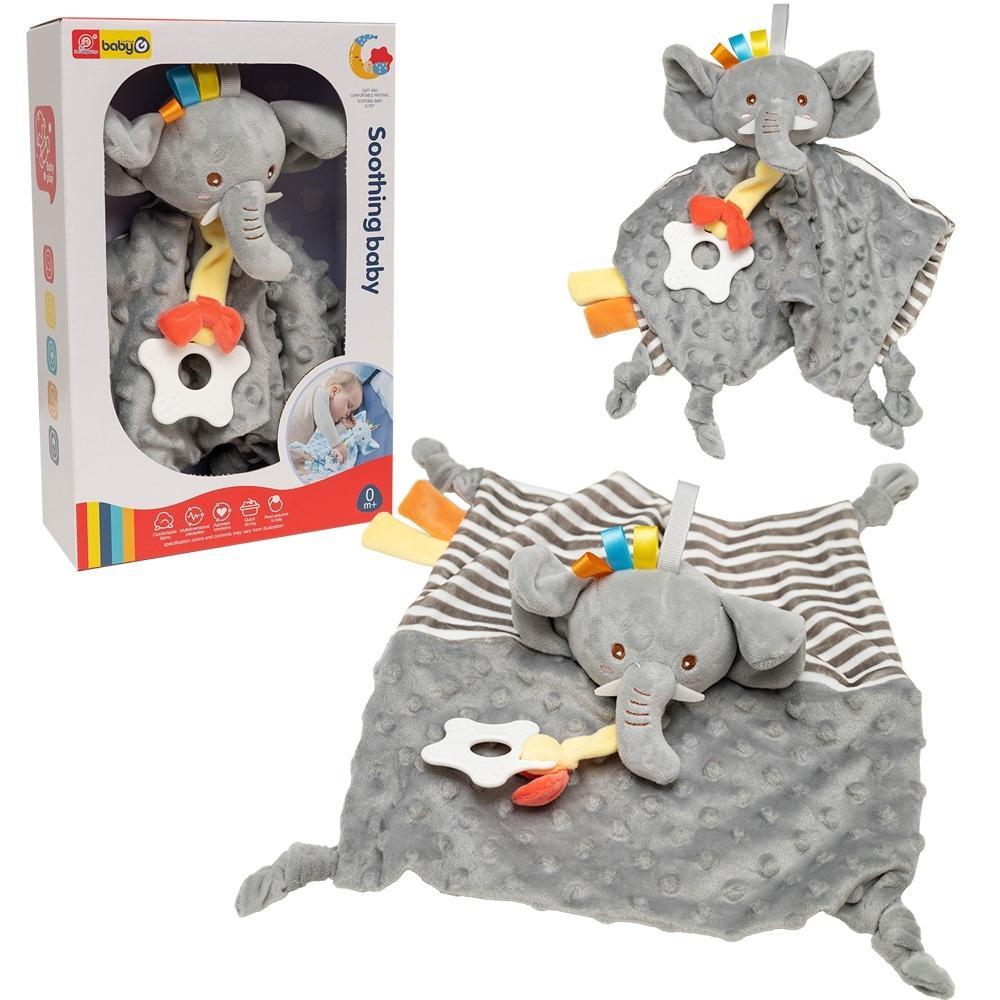 Zabawka sensoryczna w kształcie słonika to doskonały wybór dla niemowląt od pierwszych dni życia. Słonik został wykonany z miękkiej tkaniny, dzięki czemu jest bezpieczny i miły w dotyku. Zabawka posiada szeleszczące uszka oraz teksturowane wypustki, które pobudzają zmysły dziecka i wspierają jego rozwój sensoryczny. Przyczepiony do słonika gryzak łagodzi ból dziąseł podczas ząbkowania. Zabawka jest lekka i wygodna do zabrania na spacer. Wysokość zabawki: 30 cm Wymiary opakowania: 18 x 7 x 27 cm Wiek minimalny dziecka: od pierwszego dnia życia