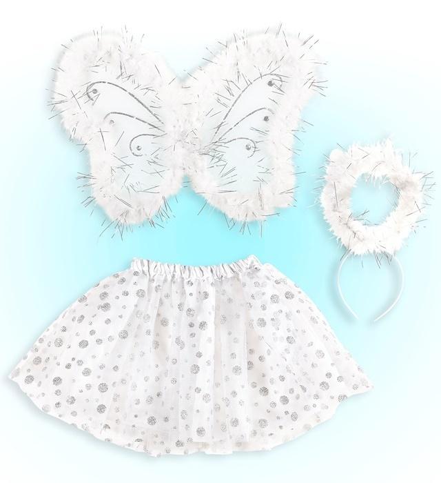 Do spódniczki dołączone są efektowne białe skrzydełka ozdobione delikatnym, miękkim puszkiem, które nadają całości subtelny i elegancki wygląd. Skrzydła mają wymiary około 42 x 32 cm, są wygodne w noszeniu dzięki praktycznemu mocowaniu, które dobrze trzyma się na plecach.