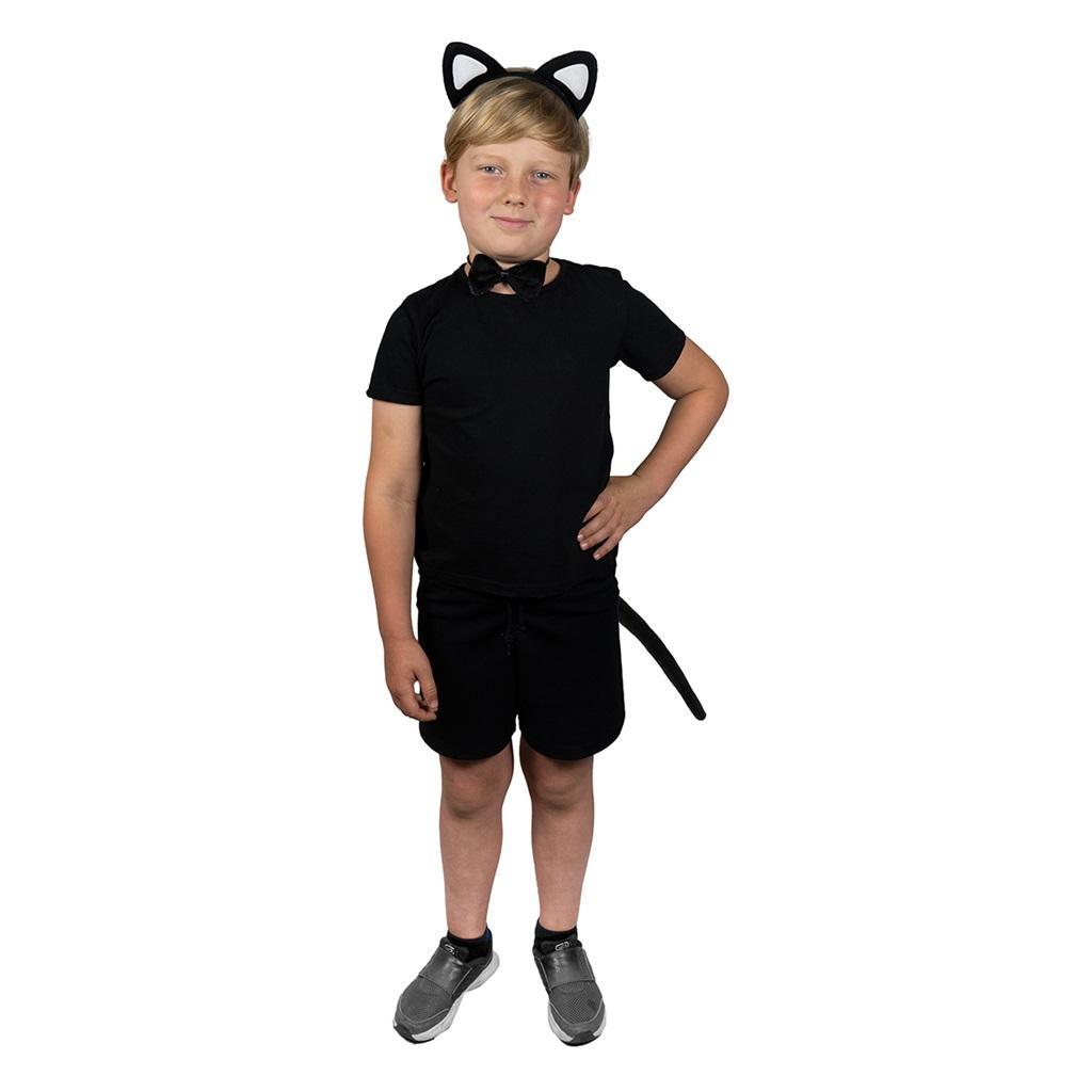 Komplet akcesoriów do stroju kotka. Zestaw wykonany z miękkiego materiału. W skład zestawu wchodzi opaska na głowę z uszami, muszka oraz ogonek. Ogon oraz mucha zostały wyposażone w elastyczną gumkę ułatwiającą ich założenie oraz zapewniającą komfortowe noszenie podczas zabawy. Komplet może być świetnym dodatkiem do stroju na bal przebierańców, zabawę tematyczną lub przedstawienie.