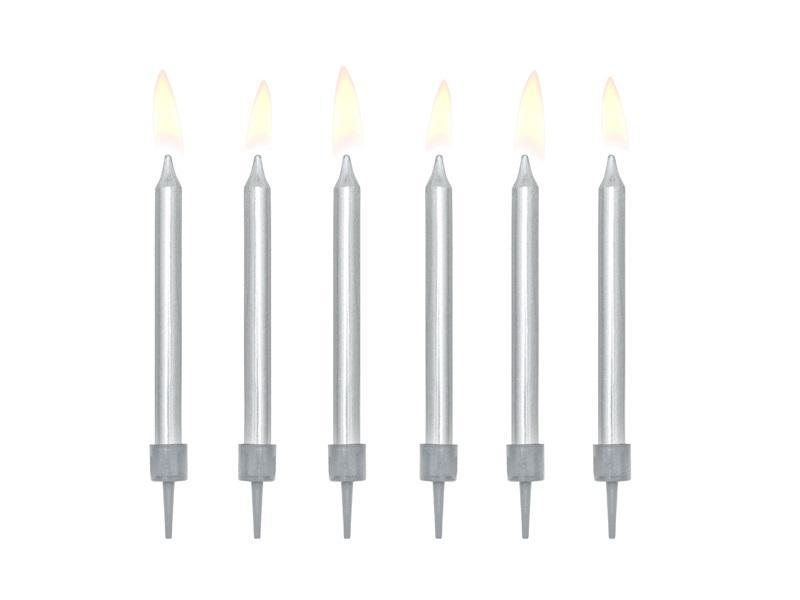 Świeczki urodzinowe gładkie w kolorze srebrnym metalizowanym, rozmiar ok. 6 cm, w zestawie 6 świeczek i 6 podstawek.(1 op. / 6 szt.)
