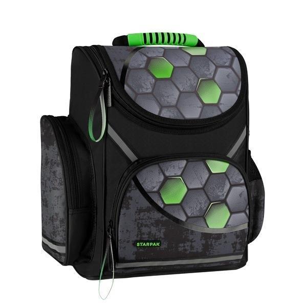 Jednokomorowy tornister typu hardbag wyposażony jest w system ergonomicznych pleców i ramion pokrytych gąbką zapewniającą swobodny przepływ powietrza i komfort użytkowania. Posiada wewnętrzny organizer, który ułatwia utrzymanie porządku. Dodatkowo, tornister został wyposażony w obszerną, przednią kieszeń na zamek i dwie mniejsze kieszenie boczne, z których jedna zapinana jest na zamek, a druga wykonana z siateczki jest idealna na bidon lub butelkę z napojem. Usztywniany, pokryty gumą dół zabezpiecza przed brudem i wilgocią. Z przodu i po bokach zostały wszyte elementy odblaskowe zapewniające dziecku bezpieczeństwo. Tornister w czarno-zielonych kolorach. Wygodny i funkcjonalny Tornister szkolny STARPAK z grafiką Football. Użytkowanie takiego plecaka to czysta przyjemność. Zapoznaj się również z innymi produktami STARPAK z tej serii. Produkt jest wyrobem tekstylnym. Przeznaczony dla dzieci w wieku: 3+. Wymiary produktu (wys. x szer. x gł.) [cm]: 37x32x22, pojemność tornistra 18l, waga produktu [kg]: 0,88 kg. Tornister pakowany w folię.