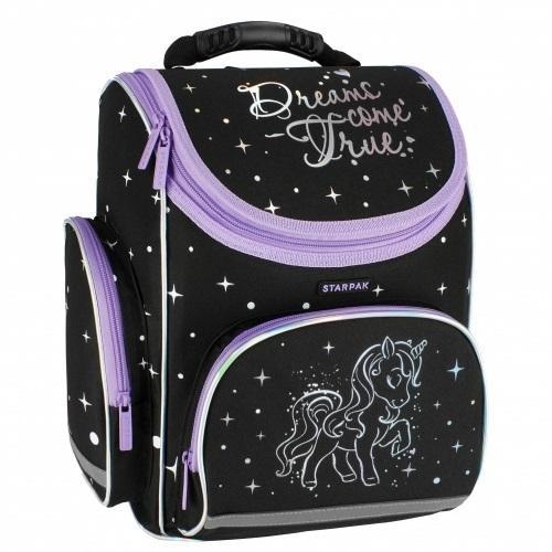 Jednokomorowy tornister typu hardbag wyposażony jest w system ergonomicznych pleców i ramion pokrytych gąbką zapewniającą swobodny przepływ powietrza i komfort użytkowania. Posiada wewnętrzny organizer, który ułatwia utrzymanie porządku. Dodatkowo, tornister został wyposażony w obszerną, przednią kieszeń na zamek i dwie mniejsze kieszenie boczne, z których jedna zapinana jest na zamek, a druga wykonana z siateczki, jest idealna na bidon lub butelkę z napojem. Usztywniany, pokryty gumą dół zabezpiecza przed brudem i wilgocią. Z przodu i po bokach zostały wszyte elementy odblaskowe zapewniające dziecku bezpieczeństwo. Tornister w czarnym kolorze z holograficzną grafiką. Wygodny i funkcjonalny Tornister szkolny STARPAK z grafiką z Jednorożcem. Użytkowanie takiego plecaka to czysta przyjemność. Zapoznaj się również z innymi produktami STARPAK z tej serii. Produkt jest wyrobem tekstylnym. Przeznaczony dla dzieci w wieku: 3+. Wymiary produktu (wys. x szer. x gł.) [cm]: 37x32x22, waga produktu [kg]: 0,88 kg. Tornister pakowany w folię. W kartonie zbiorczym po 6 szt.