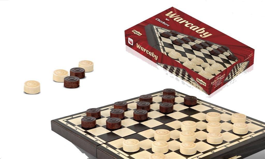 Warcaby to klasyczna gra towarzyska znana na całym świecie. Celem gry jest zbicie wszystkich pionków przeciwnika. Zestaw gry zawiera wysokiej jakości szachownicę z drewna brzozowego oraz 24 piony w dwóch kolorach (brąz i biały) z drewna bukowego. Piony podklejone są materiałem, dzięki którym szachownica nie rysuje się i są chowane wewnątrz kasety w osobnych przegrodach. Gra w warcaby rozwija logiczne myślenie, cierpliwość oraz strategiczne przewidywanie kolejnego ruchu.